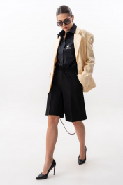 Шорты прямого свободного силуэта. Пояс на резинке, по переду боковые наклонные карманы. Задняя часть с внутренними карманами с листочкой. Длина шорт по боковому шву с поясом 59 см. Параметры брюк в готовом виде в 44 р.: обхват талии +-66 см (с резинкой ), обхват бедер 108 см. На фото: блузка S-7632, жакет S-2635