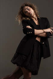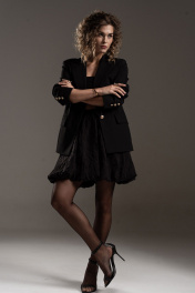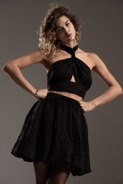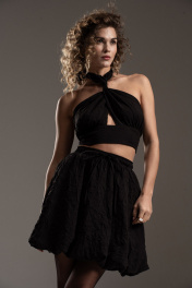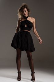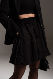 Стильная мини юбка баллон на подкладке из эффектной "жатой" вискозы. Силуэт А-образный, отрезной пояс на резинке с кулисой. В боковых швах карманы. Длина юбки с поясом по боковому шву 47 см.