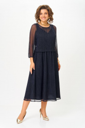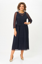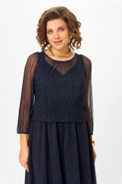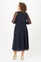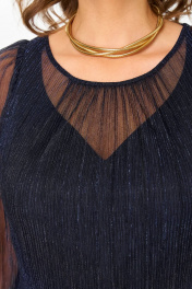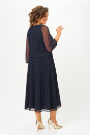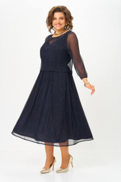Платье женское (имитация костюма) , выполнено из трикотажного полотна сетка с люрексом (состав: 100% полиэстер), на подкладке (состав: 65% вискоза, 30% п/э, 5% эластан). Платье Х-образного силуэта, отрезное по линии талии с расширенной линией низа и 2-ух слойным лифом-имитация костюма. Лиф на подкладке, верхняя часть отлетная по низу, перед и спинка цельнокроеные. Вырез горловины верхнего переда - круглый со сборкой по центру. Вырез горловины подкладки переда V- образный фигурной формы. Линия плеча укорочена на 3см от естественной. Рукав полуреглан, одношовный со сборкой по окату, низ на резинке. Юбка колокол на подкладке, с боковыми швами. Шов талии на резинке. *Возможно отличие цвета по оттенку связанное с разной цветопередачей монитора. Длина по центру спинки р.50,52-123см, р.54,56-125см (допуск(+-) 2см) Длина рукава: р.50,52,54,56- 56см (допуск (+-)1см) Обхват груди: р.50-106см, р.52-110см, р.54-114см, р.56-118см (допуск (+-)1см) Обхват талии: р.50-102см, р.52-106см, р.54-110см, р.56-114см (допуск (+-)1см) Обхват юбки по бедрам: р.50-134см, р.52-138см, р.54-142см, р.56-146см (допуск (+-)1см) Обхват рукава под проймой: р.50-43см, р.52-45см, р.54-44см, р.56-46см (допуск (+-)1см) Обхват рукава по низу с резинкой: р.50-24см, р.52-25см, р.54-25см, р.56-26см (допуск (+-)1см) Ширина плеча: р.50,52-4см, р.54,56-6см (допуск (+-)0,5см) Ширина спинки: р.50,52-34см, р.54,56-40см (допуск (+-)1см) Обхват рукава по низу максимум : р.50-36см, р.52-38см, р.54-40см, р.56-42см (допуск (+-)1см)