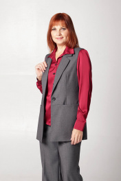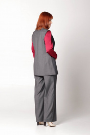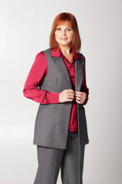 Жилет женский, на подкладке, полуприлегающего силуэта. Перед с подрезом по линии талии. В шве подреза обработаны карманы. Спинка с центральным швом и с рельефными швами из проймы. Застйжка по переду на одну петлю и пуговицу. Длина изделия по спинке - 75 см. На модели: Блуза - Модель 632, Брюки - Модель 614.