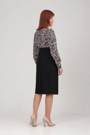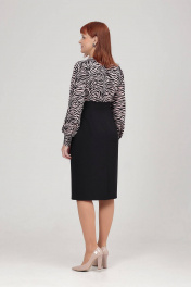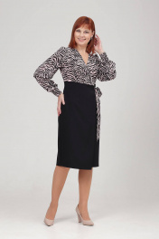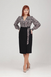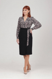Платье женское полуприлегающего силуэта, отрезное выше линии тадии, с иммитацией запаха. Верх платья выполнен из блузочной ткани, низ из более плотной ткани - плательно-костюмной. Спинка с талевыми вытачками. В среднем шве спинки обработна шлица. В боковом шве потайная молния. Рукав втачной, присборенный по окату. Низ рукава обработан манжетой с застежкой на петли-пуговицы. Длина рукава с манжетой - 63 см. Длина изделия: размер 46- 103 см; размер 48 - 104 см; размер 50 - 105 см; размеры 52,54 - 106 см.