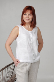 Блуза женская свободного покроя, без рукава, с нагрудной вытачкой из бокового шва. Перед по отношению к спинке укорочен на 3 см. По переду застежку на петли-пуговицы по линии груди. Длина изделия по спинке: размеры 44, 46 - 59 см; размер 48 - 60 см; размер 50 - 62 см; размер 52 - 63 см; размер 54 - 66 см.