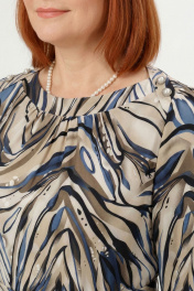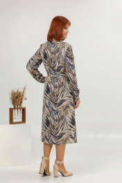 Платье женское, силуэт-трапеция, без плечевого шва. Горловина спинки и переда обработана притачными планками. Рукав втачной, длинный и присборенный по окату. По низу рукава - прорешка и складки. Нижний срез рукава обработан манжетой с застежкой на две петли и пуговицы. Тканевый пояс в комплекте. Длина рукава с манжектой - 64 см, длина изделия по спинке - 120 см.