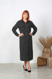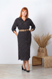 Платье-рубашка свободного покроя, расширенное к низу, со спущенным плечевым швом. Спинка с центральным швом. Перед с нагрудными вытачками из боковых швов, накладными карманами с клапанами, в области груди, и центральной застежкой на петли-пуговицы. Воротник на стойке. В боковых швах обработаны карманы. Низ изделия, в области боковых швов, оформлен полукругом. Рукав втачной, длинный. По низу рукава - прорешка и складки. Низ рукава обработан манжетой. На рукаве предусмотрена пата для регулировки длины. Длина рукава по плечевому шву с манжетой - 71 см. Длина изделия по спинке - 120 см. Ремень в комплект не входит.
