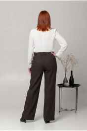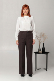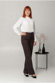 Брюки женские, прямые от колена. Перед без карманов и вытачек. Спинка с талевой вытачкой. Застёжка на молнию. Верхний срез обработан притачным поясом + шлёвки. Пояс в области спинки с резинкой. Средняя длина по боковому шву без пояса - 106 см.