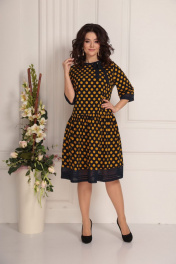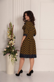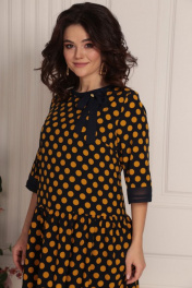 Платье женское, свободного силуэта из шифона на трикотажной подкладке. Рукава втачные, ниже уровня локтя, по низу пришиты манжеты из однотонной ткани, по манжетам застрочены горизонтальные складки. По платью ниже линии талии выполнен подрез, нижняя часть со сборкой , по низу пришита отделочная деталь с 3-мя складками из однотонной ткани. Горловина обработана планкой из однотонной ткани, по переду горловины пришит заготовленный бантик и с украшением.Длина рукава в 48р-41см.Длина изделия-104см. 48 Обхват бюста - 96см, Обхват талии - 76-80см, Обхват бёдер - 104см. 50 Обхват бюста - 100см, Обхват талии - 80-84см, Обхват бёдер - 108см. 52 Обхват бюста - 104см, Обхват талии - 84-88см, Обхват бёдер - 112см. 54 Обхват бюста - 108см, Обхват талии - 88-92см, Обхват бёдер - 116см. 56 Обхват бюста - 112см, Обхват талии - 92-96см, Обхват бёдер - 120см.