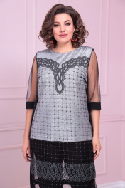 Комплект женский состоит из очень нарядной блузы и брюк. Блуза -футляр, полуприлегающего силуэта. Изделие состоит из полуприлегающей блузы и свободной кружевной накидки с сеткой, повторяющей силуэт изделия. Полочка блузы с нагрудными вытачками. Верхняя накидка с боковыми разрезными швами. Перед с красивого тонкого кружева начинается по горловине имитацией глубокого выреза, переходит в клеточку и заканчивается кружевной полоской. Рукав выполнен из сетки в цвет кружева и заканчивается манжетой из однотонной ткани. Спинка из обычной сетки, в цвет кружева. Рукав втачной. Длина рукава ниже локтя. Накидка соединена с основной блузой по пройме и горловине. Горловина обработана обтачкой. Брюки женские зауженные к низу, на широком поясе, по переду карманы, застежка молния и пуговицы. 50 Обхват бюста - 100см, Обхват талии - 80-84см, Обхват бёдер - 108см. 52 Обхват бюста - 104см, Обхват талии - 84-88см, Обхват бёдер - 112см. 54 Обхват бюста - 108см, Обхват талии - 88-92см, Обхват бёдер - 116см. 56 Обхват бюста - 112см, Обхват талии - 92-96см, Обхват бёдер - 120см. 58 Обхват бюста - 116см, Обхват талии - 96-100см, Обхват бёдер - 124см. 60 Обхват бюста - 120см, Обхват талии - 100-104см, Обхват бёдер - 128см.