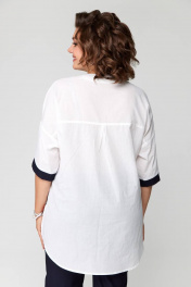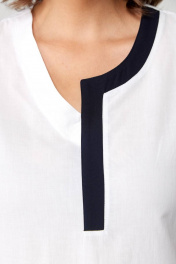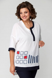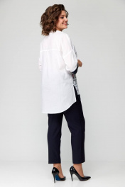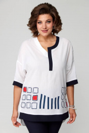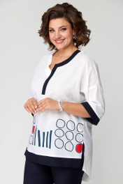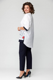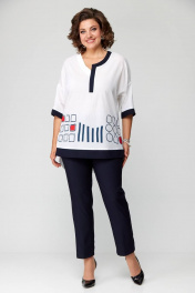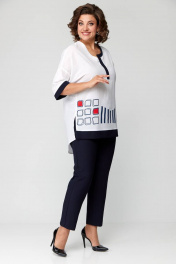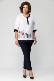 Комплект представлен в 2 цветах: темно-синие брюки и белая блуза с синей печатью; красные брюки и белая блуза с красной печатью. Комплект женский из двух предметов (брюки и блуза).Рекомендуем для женщин разного возраста и разного телосложения. Блуза выполнена из легкой хлопковой дышащей ткани. Полочка прямая без нагрудных вытачек, горловина фигурная с отделочной контрастной деталью. По низу полочки печать и по краю отделка в цвет брюк. По спинке кокетка и в центре полочки неглубокая встречная складка, спинка длиннее переда. По бокам блузы разрезы. Рукав спущенный прямой, заканчивается пришивной манжетой из отделочной ткани в цвет брюк. Брюки классические с высокой посадкой, слегка заужены к низу. По задней половине брюк карманы-обманки. По передней части брюк действующие карманы-хулиганы. Застежка молния и две петли пуговицы. Пояс притачной со шлёвками. Длина блузки передняя часть 73см,спинка 83см. Длина брюк по боковому шву 98см. Бережная стирка при 30 градусах!
