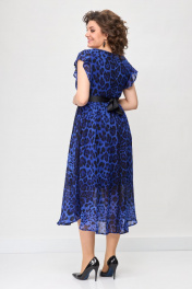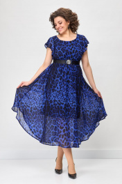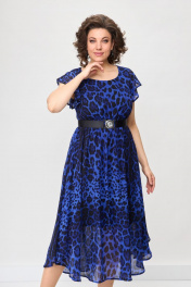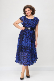 Платье женское из модной, со звериным принтом, шифоновой ткани, отрезное по линии бедер. По полочке нагрудные вытачки, по спинке - талевые. Платье на резинке на уровне груди. По спинке потайная молния. Юбка изделия-полуклеш. Платье на подкладке. Рукав крылышко. Украшением платья служит пояс ( состоящий из двух частей, сзади на завязке), который входит в комплект.