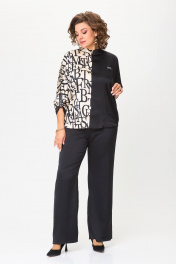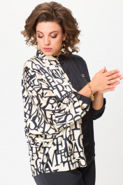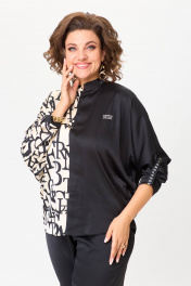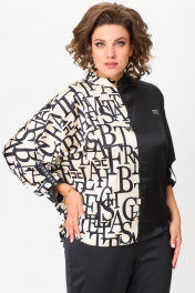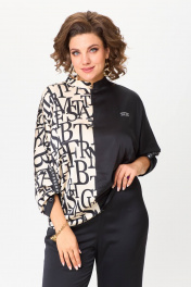 Блузка женская силуэта "летучая мышь" с цельнокроеным рукавом, без плечевых накладок, блуза выполнена из комбинировании 2-х видов ткани. Воротник стойка. Перед: полочка прямого силуэта со средним швом, в верхней части которой обработана потайная молния, на левой части пришито прямоугольное украшение со стразами. Одна полочка из ткани с расцветкой алфавит, другая полочка из ткани черного цвета. Спинка: резная, по центру притачивается планка шириной 8 см из эко-кожи, на которую настрачивается отделочная тесьма с надписями, одна часть спинки из ткани черного цвета, а другая из ткани в расцветку "алфавит" черно-бежевого цвета. Низ рукава обработан манжетой на одну петлю-пуговицу. На уровне локтя выполнен подрез в который вставлена пата застегивающая на пуговицу. которая регулирует длину рукава. Длина изделия в 50р-63 см.