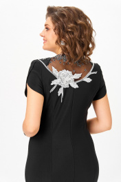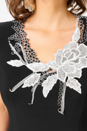 Платье облегающего силуэта. Украшением изделия служит вставка-аппликация, вышитая на сетке. Аппликация расположена спереди и по спинке платья. По передней части рельефы, внизу полочки слева вырез. Рукава короткие фигурные. По спинке шлица. Элементы декора: аппликация по горловине и сеточка по вырезу спинки. Особенности ткани: тянется хорошо, средней плотности.