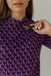 Классическое, очаровательное платье. Приятное к телу. Мини длина, рукав три четверти с красивыми разрезами, силуэт у модели приталенный. Вырез выполнен в виде невысокой стойки. Платье украшает красивая брошь- стрекоза. Замечательный вариант для будней и не только.