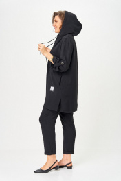 Костюм женский трехпредметный, состоящий из кардигана, топа и брюк. Кардиган прямого силуэта с втачным рукавом. По горловине капюшон со шнурком. Рукава кардигана фиксируются на верх патой. Сборка по рукаву зафиксирована. В боковых швах обработаны карманы и разрезы. Топ полуприлегающего силуэта. Декорирован аппликацией из ткани. Брюки прямые зауженные книзу с отворотом. Пояс притачной на широкой резинке. Ткань костюм не тянется. Длина кардигана 85 см Длина рукава 43 см Длина топа 70 см Длина брюк 92 см
