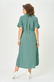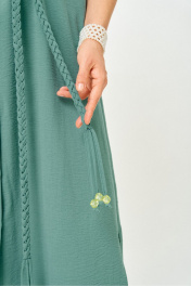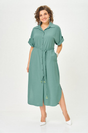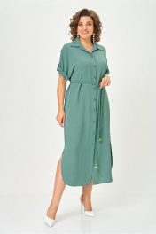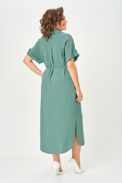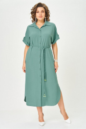 Платье женское прямого силуэта со спущенной линией плеча. Застежка центральная на 8 петель и пуговиц. Воротник отложной на стойке. По верхней части спинки кокетка, нижняя часть спинки со встречной складкой. В боковых швах карманы. По линии талии пояс в тон ткани. Низ рукава с манжетой и декоративной патой. Платье с фигурной линией низа и разрезами. Фурнитура может меняться от наличия. Длина платья по спинке: 132 см Длина рукава от горловины: 38см