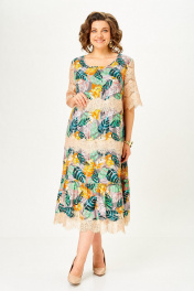 Платье женское А – силуэта с втачным рукавом. По линии груди переда вытачки. По низу платья широкая отделочная деталь со сборкой. Рукава платья выполнены из кружева. Низ платья и каждый ярус декорированы кружевом. Широкий размерный ряд. Длина платья по спинке: 117 см Длина рукава: 30 см