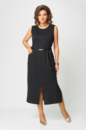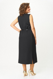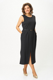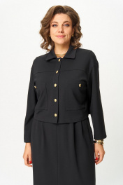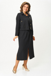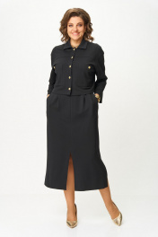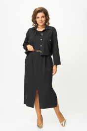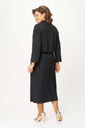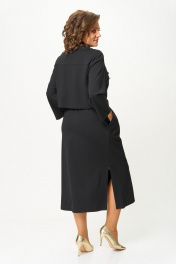 Костюм женский двухпредметный из эластичного трикотажного полотна состоящий из платья и жакета. Платье полуприлегающего силуэта. Перед платья с горизонтальным эластичным швом по талии. Верхняя часть с вытачками по линии груди, нижняя часть со складками в области талии и карманами что обеспечивает прекрасную посадку и подчеркивает фигуру. Высокие разрезы по бокам и переду платья добавляют удобства. В комплекте съемный ремень. Жакет прямого кроя с застежкой на петли и пуговицы, с длинным втачным рукавом. Линия плеча спущена, по горловине отложной воротник. Перед с кокеткой, накладными карманами. Спинка цельнокроеная с кокеткой. Фурнитура может меняться от наличия. Длина платья по спинке: 123 см Длина жакета по спинке: 46 см Длина рукава от горловины: 66 см