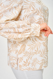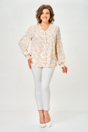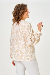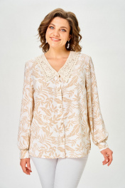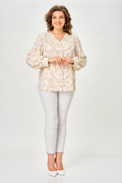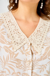 Блузка женская прямого силуэта, с втачным рукавом. Горловина v-образной формы. Отделкой служит воротничок из кружева. Застежка центральная на пять петель и пуговиц. По линии груди вытачки. Рукав длинный расширенный к низу, на притачной манжете с застежкой на петлю и пуговицу. В боковых швах обработаны разрезы. Фурнитура может меняться в зависимости от наличия. Длина середины спинки: 65 см Длина рукава: 62 см