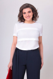 Блузка женская, прямого силуэта. Блуза выполнена из итальянского крепа. По переду нагрудная вытачка и три горизонтальные застроченные складки. Горловина круглая. Спинка цельнокроеная, по горловине обработана капелька, которая застёгивается на навесную петлю и пуговицу. В нижней части боковых швов обработаны разрезы. Рукав втачной, короткий. Длина рукава 20 см. Длина блузки 63 см (±1 см). Данная модель блузы прекрасно сочетается с брюками модель М-532.