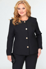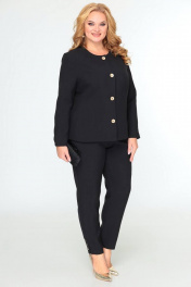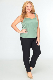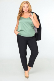 Комплект 3-х предметный, состоящий из жакета, брюк и топа. Жакет и брюки выполнены из качественной костюмной ткани. Жакет однобортный на подкладке. По переду - рельефы, по спинке средний шов. Рукав втачной двушовный. Застежка на 4 петли и 4 декоративные пуговицы. Длина по спинке 59 (+/-1) см., длина рукава 44 (+-/1) см. Брюки прямые, слегка заужены к низу, по переду обработаны карманы с отрезными бочками. Пояс притачной с резинкой по спинке. По низу брюк в боковом шве обработана декоративная шлица, с 3-мя декоративными пуговицами. Длина 104 (+/-1) см. Блуза прямого силуэта, на широких бретелях, выполнена из струящейся блузочной ткани. Горловина переда с V-образным вырезом. По переду блузы обработаны нагрудные вытачки. Спинка цельнокроеная. Ширина бретели 3см. Длина блузы (от плечевой линии) 59 см (+/-1см).