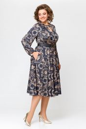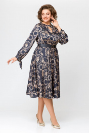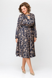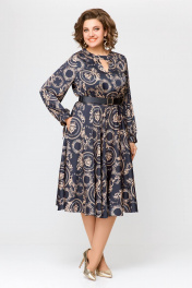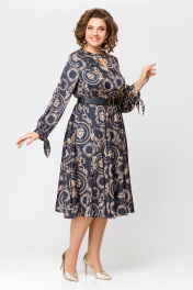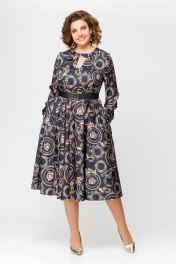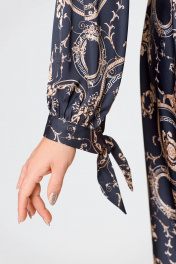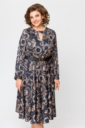 Платье из искусственного шёлка Х-образного силуэта, отрезное по линии талии. По переду лифа обработаны нагрудные вытачки, удлинённый V-образный вырез и отрезанная декоративная кокетка с застёжкой на кнопку. Спинка лифа цельнокроеная. Юбка расклешённая с карманами в боковых швах. Рукав втачной, одношовный со сборкой по шву притачивания манжеты. По низу рукава обработана манжета с завязками. По талии платье собрано на эластичную тесьму. длина рукава 63см (±1см). Длина изделия по спинке 116 см. Рост модели на фото 170 см РЕМЕНЬ НЕ ВХОДИТ В КОМПЛЕКТ. В комплект входит пояс из основной ткани.