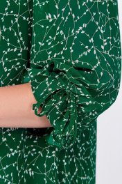 Платье А-силуэта, из струящейся шифоновой ткани на подкладке из шифона. По переду платья нагрудные выточки, выходящие из проймы, спинка цельная. Вырез горловины овальный. Рукав длиной 7/8, в нижней части кулиса с завязкой, которая регулирует ширину рукава и создаёт по низу рюшу. Длина платья по спинке 103 см.(+-1 см) Длина рукава регулируется завязкой.