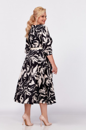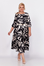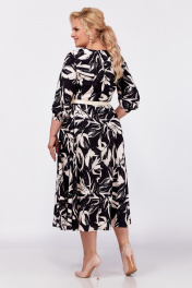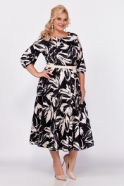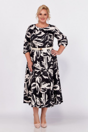 Платье из струящейся вискозной ткани , Х-образного силуэта с полуприлегающим лифом. Платье отрезное по линии талии. По переду лифа расположены рельефы, по спинке лифа талиевые выточки. Юбка расклешенная из шести клиньев со встречными складками по линии талии. В среднем шве спинки предусмотрена молния. Рукав втачной длиной ¾, по низу манжета с эластичной вставкой . Длина рукава – 48 см. В комплекте ремень с декоративной пряжкой. В 64 размере пояс из основной ткани. Длина изделия по спинке 120 (+/-1) см