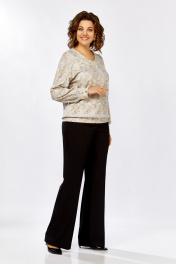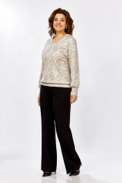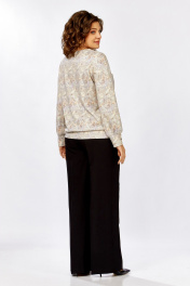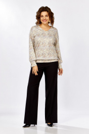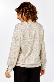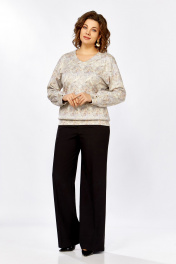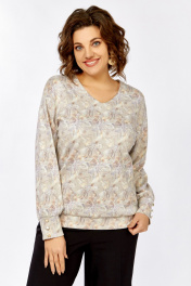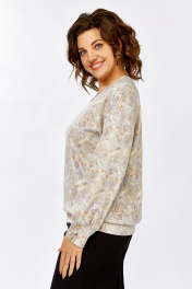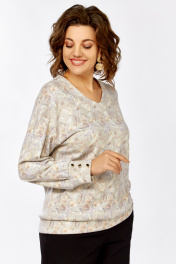 Джемпер из мягкого вискозного трикотажного полотна свободного силуэта со спущенной линией плеча. Горловина мягкой V-образной формы, рукав длинный, по низу присобран на манжеты из основной ткани, которые украшены тремя декоративными пуговицами. Низ джемпера оформлен притачной планкой из основной ткани. Длина изделия по спинке – 61(+/-2) см Длина рукава с манжетой от высшей точки горловины- 72 см.
