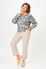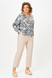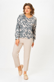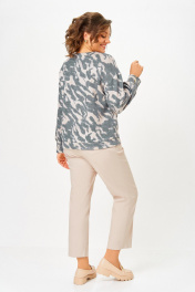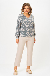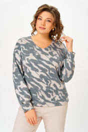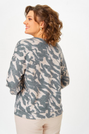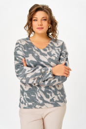 Джемпер из мягкого вискозного трикотажного полотна с люрексовой нитью, свободного силуэта со спущенной линией плеча. Горловина мягкой V-образной формы, рукав длинный, по низу присобран на манжеты из основной ткани, которые украшены тремя декоративными пуговицами. Низ джемпера оформлен притачной планкой из основной ткани. Длина изделия по спинке – 61(+/-2) см Длина рукава с манжетой от высшей точки горловины- 72 см.