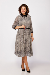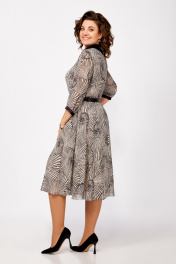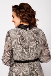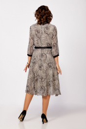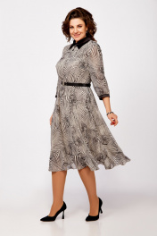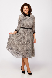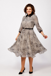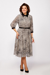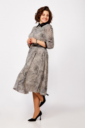 Платье из нежного шифона на трикотажной подкладке, отрезное по линии талии, длины миди. Лиф полуприлегающего силуэта. По полочке лифа нагрудные вытачки, по спинке средний шов и талиевые вытачки. Юбка расклешенная. По горловине отложной воротник рубашечного типа из отделочной ткани. Рукав втачной одношовный длиной ¾, внизу со сборкой и манжетой из декоративной ткани. В среднем шве спинки застёжка на потайную тесьму-молнию, на стойке сзади две навесные петли и декоративные пуговицы. Платье украшено брошью и ремнём с декоративной пряжкой. Длина платья по спинке в р.50-54 – 112(+/- 2) см., в р.56-60 – 117 (+/-2) см. Длина рукава – 45 см.