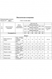 Жакет двубортный из поливискозной ткани на подкладке. По полочке прорезные карманы в рамку с клапаном, талиевые вытачки и бочки, переходящие на спинку. Спинка с центральным швом и бочками. Воротник пиджачного типа с отрезной стойкой и лацканами. Рукав втачной, двухшовный, длинный со шлицей по локтевому шву и тремя декоративными пуговицами. Застёжка на петли и декоративные пуговицы. Длина жакета по спинке – 75 (+/- 1) см. Длина рукава – 64 см.
