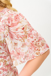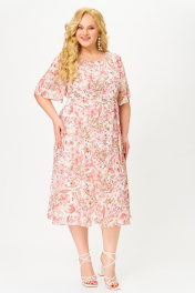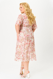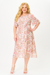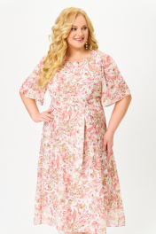 Платье полуприлегающего силуэта из мягкой шифоновой ткани на трикотажной подкладке. Полочка с отрезными рельефами, спинка с центральным швом и рельефами. Горловина округлой формы. Рукав втачной, формы «колокол», по окату с лёгкой сборкой, длиной 34 см. В центральном шве спинки застёжка на потайную тесьму-молнию. В комплете пояс из основной ткани. Длина платья по спинке в р.54,56,58 – 111(+/-2) см. Р.60,62,64 – 116(+/-2) см.