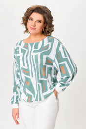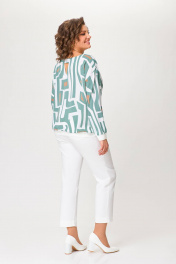 Блузка из мягкой вискозной ткани свободного силуэта со спущенной линией плеча. Горловина по полочке округлой формы, по спинке – V-образный вырез, который соединён планкой. Рукав втачной, длинный. Низ блузки и низ рукавов присобраны на декоративный трикотажный довяз. Длина блузки от высшей плечевой точки р.50,52,54 – 67(+/-1) см., р.56,58,60 – 69(+/-1) см. Длина рукава от высшей плечевой точки р.50,52,54 – 67(+-1) см., р. 56,58,60 – 71(+/-1) см