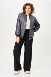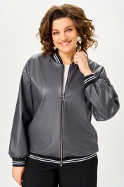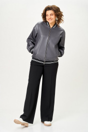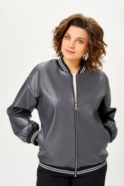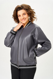 Бомбер женский из мягкой экокожи на подкладке свободного кроя со спущенной линией плеча и с центральной застёжкой на декоративную металлическую молнию. Полочка с отрезными бочками и карманами в 54, 56, швах. Горловина округлая со стойкой из трикотажного довяза. Рукав длинный. По низу рукава и изделия - довяз. Длина изделия по спинке – 65 см