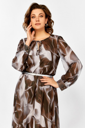 Платье из креп-шифоновой ткани, на трикотажной подкладке, отрезное по линии талии, шов собран на эластичную тесьму-резинку. Горловина округлой формы, по переду капелька с завязкой. Рукав втачной одношовный, внизу со сборкой и манжетой, которая застёгивается на 2 петли и пуговицы. Юбка расклешённая. Подкладка лифа платья на бретелях. В подарок ремень с декоративной пряжкой. Длина рукава 63 см (+ /- 1 см) Длина платья по спинке 118 см (+ /- 2 см)