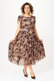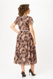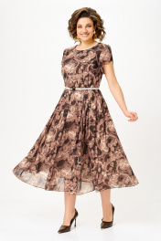 Платье из шифона на трикотажной подкладке, Х-образного силуэта с полуприлегающим лифом. Платье отрезное по линии талии. По переду лифа расположены рельефы, по спинке лифа талиевые выточки. Юбка расклешенная из шести клиньев со встречными складками по линии талии. В среднем шве спинки предусмотрена потайная тесьма- молния. Рукав втачной покроя тюльпан, длина рукава 15 см. В подарок ремень с декоративной пряжкой. Размер 64 комплектуется поясом из основной ткани. Длина изделия по спинке 120 см