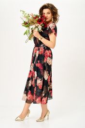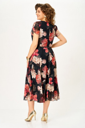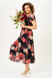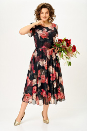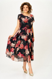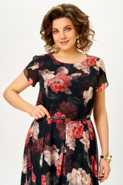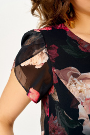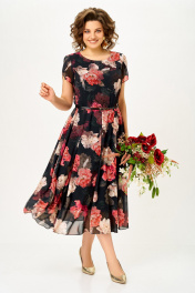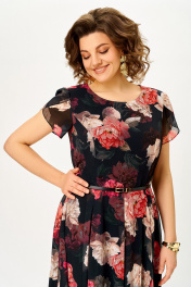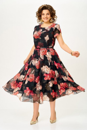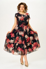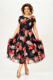 Платье из шифона на трикотажной подкладке, Х-образного силуэта с полуприлегающим лифом. Платье отрезное по линии талии. По переду лифа расположены рельефы, по спинке лифа талиевые выточки. Юбка расклешенная из шести клиньев со встречными складками по линии талии. В среднем шве спинки предусмотрена потайная тесьма- молния. Рукав втачной покроя тюльпан, длина рукава 15 см. В подарок ремень с декоративной пряжкой. Размер 64 комплектуется поясом из основной ткани. Длина изделия по спинке 120 см