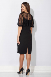 Платье женское, полуприлегающего силуэта с коротким рукавом. Рукав типа "фонарик" со сборкой сверху и снизу. По низу притачная манжета. По переду нагрудные вытачки. Горловина круглой формы. По низу ассиметричная, отлетная планка с разрезом и декоративная нашивка. По спинке средний шов с разрезом снизу и талевые вытачки. Горизонтальный подрез выше линии талии. Верхняя часть спинки и рукав выполнены из ткани сетка с флоковым нанесением. Застежка на потайную "молнию"