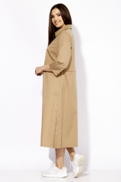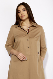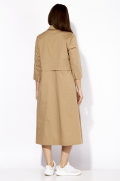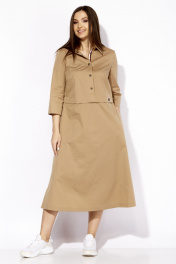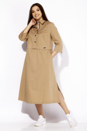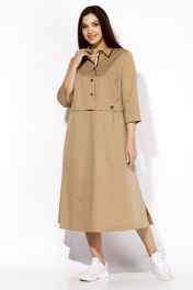 Платье женское, расширенное к низу, отрезное по талии. Рукав втачной, длиной 3/4, по низу с разрезом на локтевом шве. По переду нагрудные вытачки. Воротник рубашечный на отрезной стойке. Застежка лифа платья центральная, на кнопки. Внутренняя планка акцентирована отделочной тесьмой. Спинка со средним швом. По низу лифа отлетная складка. Нижняя часть платья (юбка) расширенная, с карманами и разрезами по бокам.