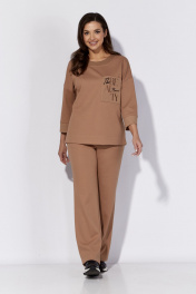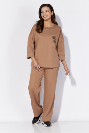 Комплект женский, 2х предметный, состоящий из джемпера и брюк. Джемпер прямого силуэта с рукавом длинной 7/8. Рукав со спущенной линией плеча и отрезной манжетой по низу. Горловина круглой формы, с подрезной планкой по переду. По бокам разрезы. Акцентом служит накладной карман по переду, задекорированный вышивкой и принтом. Брюки прямые, с наклонными карманами спереди. Пояс притачной, с резинкой по кругу.