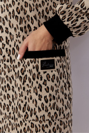 Платье женское, прямого силуэта с длинным рукавом. Рукав покроя "реглан", снизу на манжете. По переду нагрудные вытачки и накладные карманы с отделочной нашивкой. Вход в карман акцентирован контрастной бейкой. Вырез горловины круглой формы, с широкой бейкой. Спинка без особенностей.