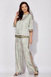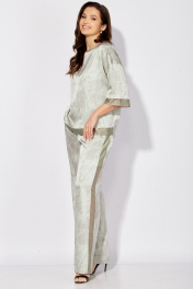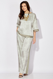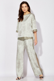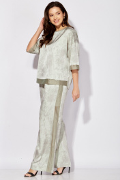 Комплект женский, 2х предметный, состоящий из блузки и брюк. Блузка прямого силуэта, объемная, с коротким рукавом. Рукав со спущенной линией плеча. По низу рукавов и низу переда блузки притачные детали, из отделочной ткани, с отлетной складкой. Спинка чуть удлиненная, с широкой подгибкой. Горловина круглой формы, с отделочной бейкой по переду. Брюки прямые, с лампасами из отделочной ткани по бокам. Спереди наклонные карманы. Пояс притачной, по центру переда гладкий, далее с резинкой по кругу. ВНИМАНИЕ! Подвеска в комплект не входит!