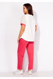 Комплект женский, 2х предметный, состоящий из блузки и брюк. Блузка прямого силуэта, выполнена в сочетании вискозного трикотажного полотна и шитья. Рукав короткий, цельнокроеный с манжетой. По переду и спинке фигурные рельефы с отлетными планками. Горловина круглой формы с подрезной бейкой. Центр переда задекорирован принтом. На спинке кокетка и отделочная нашивка. Низ фигурной формы. Брюки из дресса двухнитка. Прямые, по низу с отворотами. По переду карманы. Пояс отрезной с отделочной кулисой и резинкой по кругу.