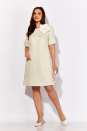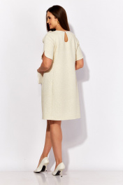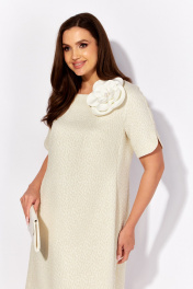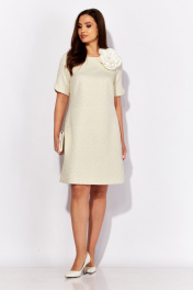 Платье женское, А силуэта с коротким рукаквом. Рукав покроя "реглан" с фигурным разрезом. Вырез горловины круглой формы. По спинке застежка на навесную петлю и пуговицу и вырез "капля" Силуэтность платью придают рельефы переда и спинки с цельнокройными бочками. Декором служит съемный цветок из отделочной ткани.