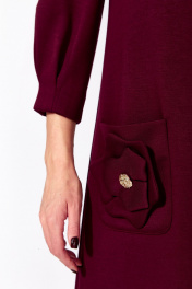 Платье женское, А силуэта, с рукавом длинной 3/4. Рукав втачной, со сборкой по окату, и мягкими складками по низу. По переду нагрудные вытачки. Вырез горловины круглой формы. Карманы накладные, акцентированы стилизированным цветком с декором. По спинке средний шов с отделочной нашивкой сверху.