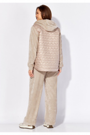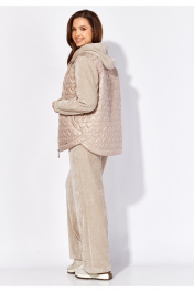 Комплект женский, 2х предметный, состоящий из куртки и брюк, выполнен из двух видов материала. Куртка с сочетании плащевки стеганой на синтепоне и Миланский вельвет со стрейчем. По переду рельефы из пройм, карманы. Вход в карман закругленной формы с отрезной планкой. Застежка центральная на тесьму "молния" Низ куртки фигурной формы, по спинке удлиннен, с отрезной планкой. Рукав длинный, втачной, по низу на манжете. Горловина оформлена капюшоном с кулисой по краю . Брюки прямые, выполнены из ткани Миланский вельвет. По переду наклонные карманы. Пояс притачной с резинкой по кругу.