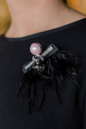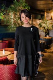 Платье свободного силуэта с притачным воланом снизу. Рукав длинный. Платье украшено съемной брошью. Горловина круглая, обработана притачной бейкой из тафты. Платье выполнено из стрейчевого крепа, пришивной волан из тафты. Длина платья 96 см. Длина рукава 49 см.