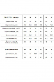 Туника женская, удлиненная, к низу чуть расклешенная. Застежка центральная на планку до низа. Воротник рубашечный на стойке. Рукава втачные , с цельнокроеным заутюженным вверх манжетом. Длина рукава3/4, можно удлинить - отвернув вниз манжет. На полочках обработаны нагрудные вытачки. Жилет женский ,укороченный, без подкладки с застежками по бокам на одну пуговицу ,выполнен из трикотажного полотна. Горловина овальной формы, обработана бейкой.