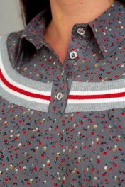 Блуза женская, «А» - силуэта. Рукав длиной 3/4, присобранный на манжет из трикотажного полотна. Так же трикотажное полотно в виде полоски настрочено на кокетку полочки по линии притачивания. Застежка центральная, на кокетках полочек, на планку. Воротник рубашечный, на стойке. По бокам, в швах обработаны карманы. От кокетки полочки идут нагрудные складки. Низ изделия впереди короче, а по спинке длиннее.