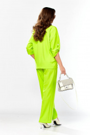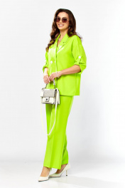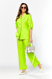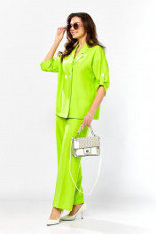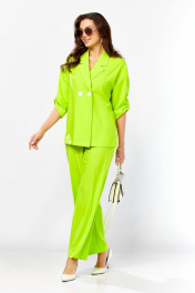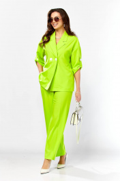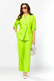 Очень стильный ,элегантный ,модный женский комплект . Состоит их брюк палаццо и жакета прямого силуэта , со спущенной проймой ,что придает свободу движению и комфорта при носке. Интересный дизайн жакета , двубортный с одним рядом крупных пуговиц контрастного цвета. Рукав на пате с пуговицей контрастного цвета меньшего размера. При желании рукав можно удлинить ,расстегнув пуговицу. Длина жакета по спинке от плеча — 70,5 см Брюки палаццо прямые с функциональными карманами ,сзади на резинке. Длина брюк -101