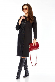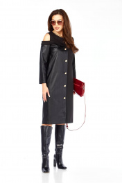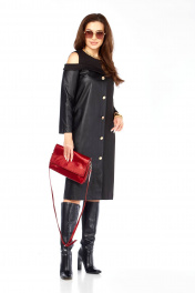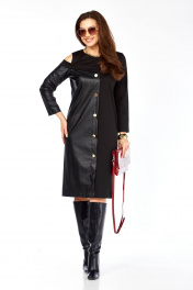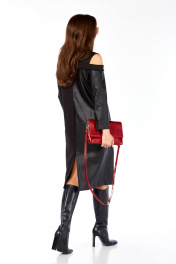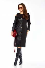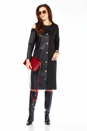 Стильное , шикарное женское платье из трикотажной ткани и кожи .Платье полуприлегающего силуэта ,интересного сложного дизайна , по переду и спинке наполовину с трикотажной ткани и кожей, по переду качественная фурнитура, т.е. пуговицы металл под золото. Платье может подойти на все случаи жизни . Сзади потайная молния , по низу разрез